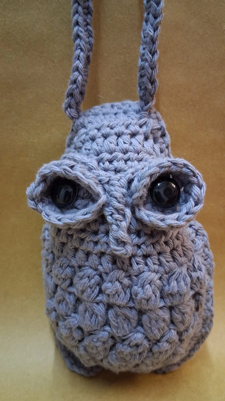 Está confeccionada en hilo de algodón gris, con ojos grandes y expresivos que transmiten atención y calma. Viene con una tira larga tejida, lista para colgar donde más te guste.