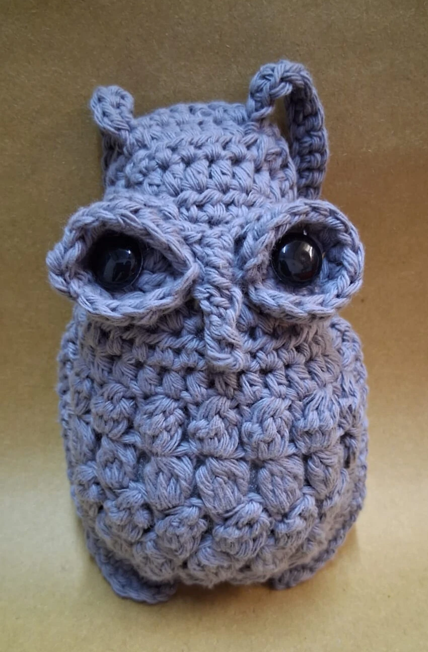 Esta lechuza no es solo un adorno; es una pequeña guardiana tejida a mano. Su diseño destaca por la textura en relieve (punto escama) que simula su plumaje, dándole un acabado rico y agradable al tacto.