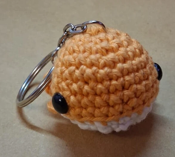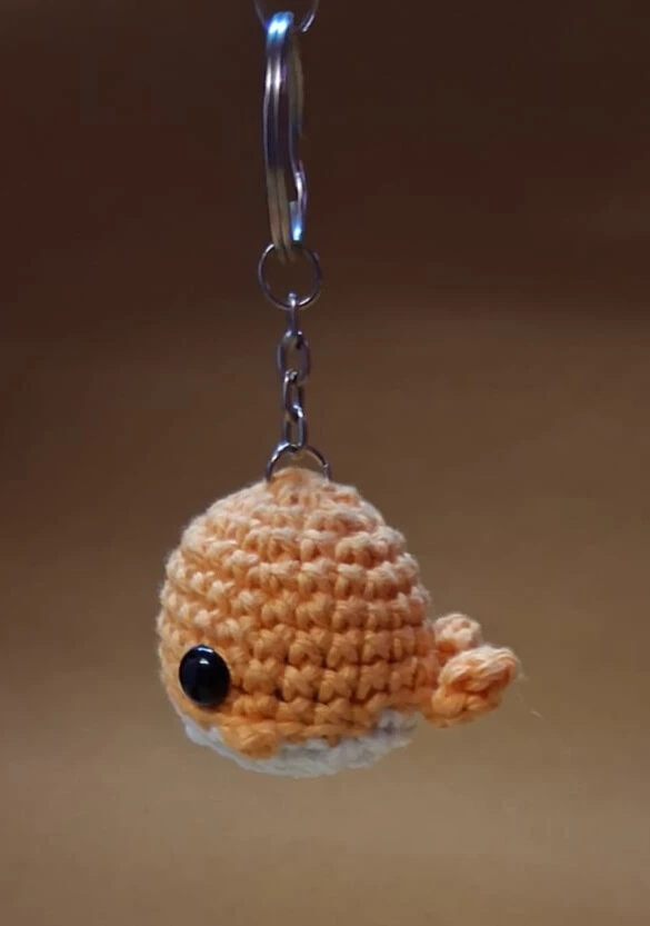 Está tejida en hilo de algodón, con la panza blanca y aletas pequeñitas. Su tamaño compacto es perfecto: lo suficientemente grande para encontrar fácil las llaves en el bolso, pero lo suficientemente chica para que no moleste en el bolsillo.