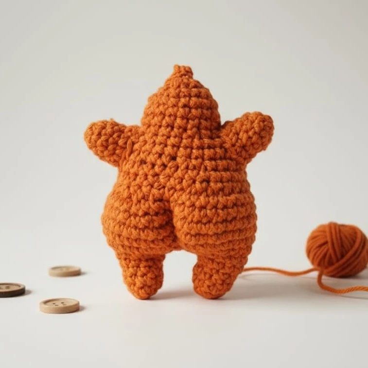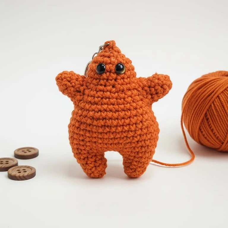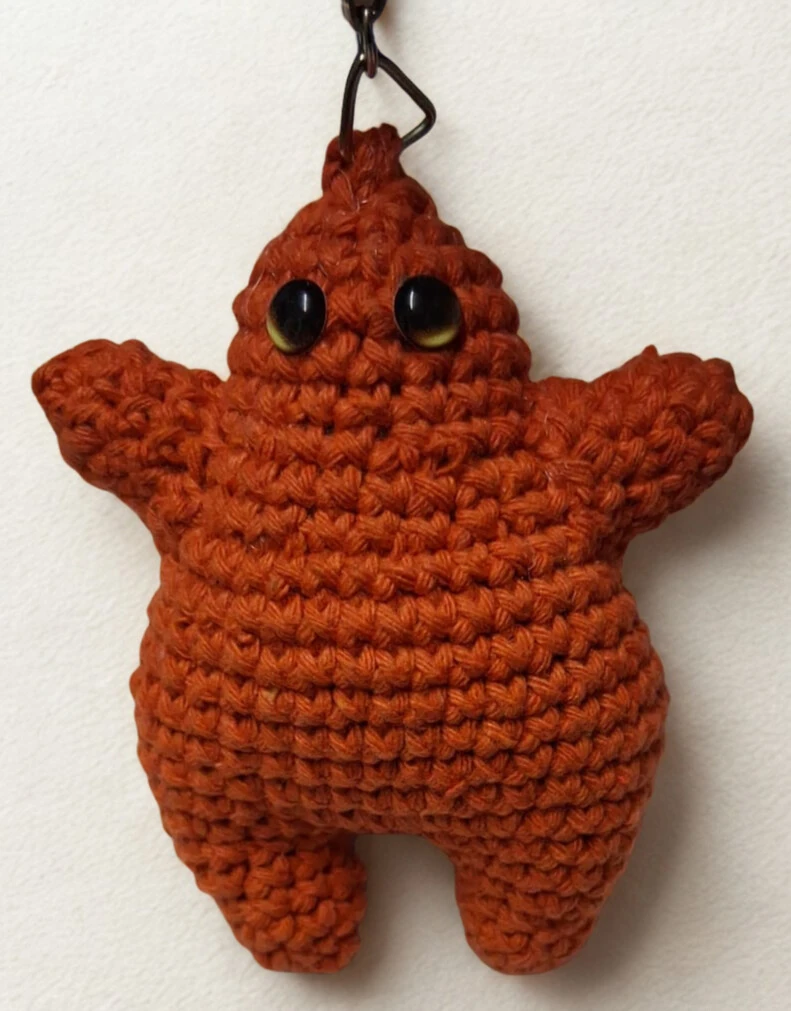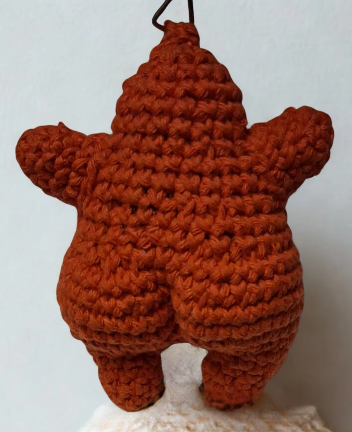 Está tejida a mano en hilo de algodón color naranja, con una carita simpática por delante y... bueno, la sorpresa por detrás. Es el accesorio definitivo para ponerle humor a tus llaves, mochila o espejo del auto.