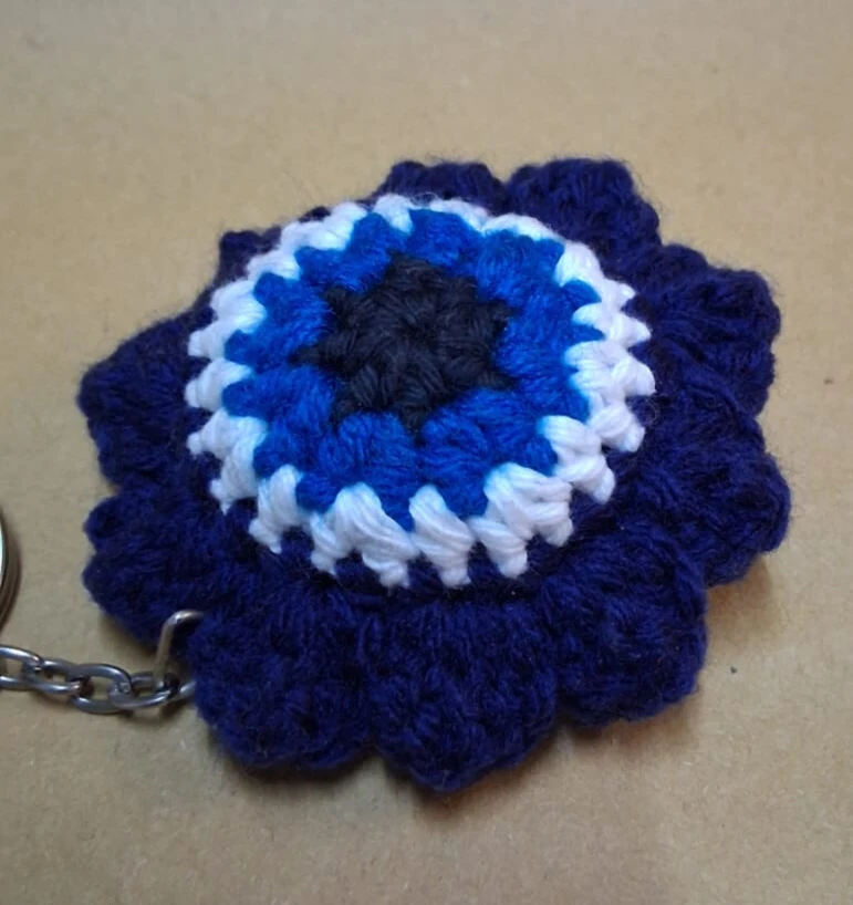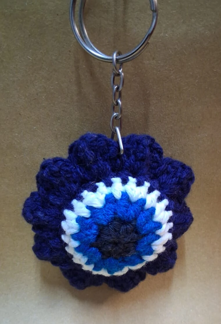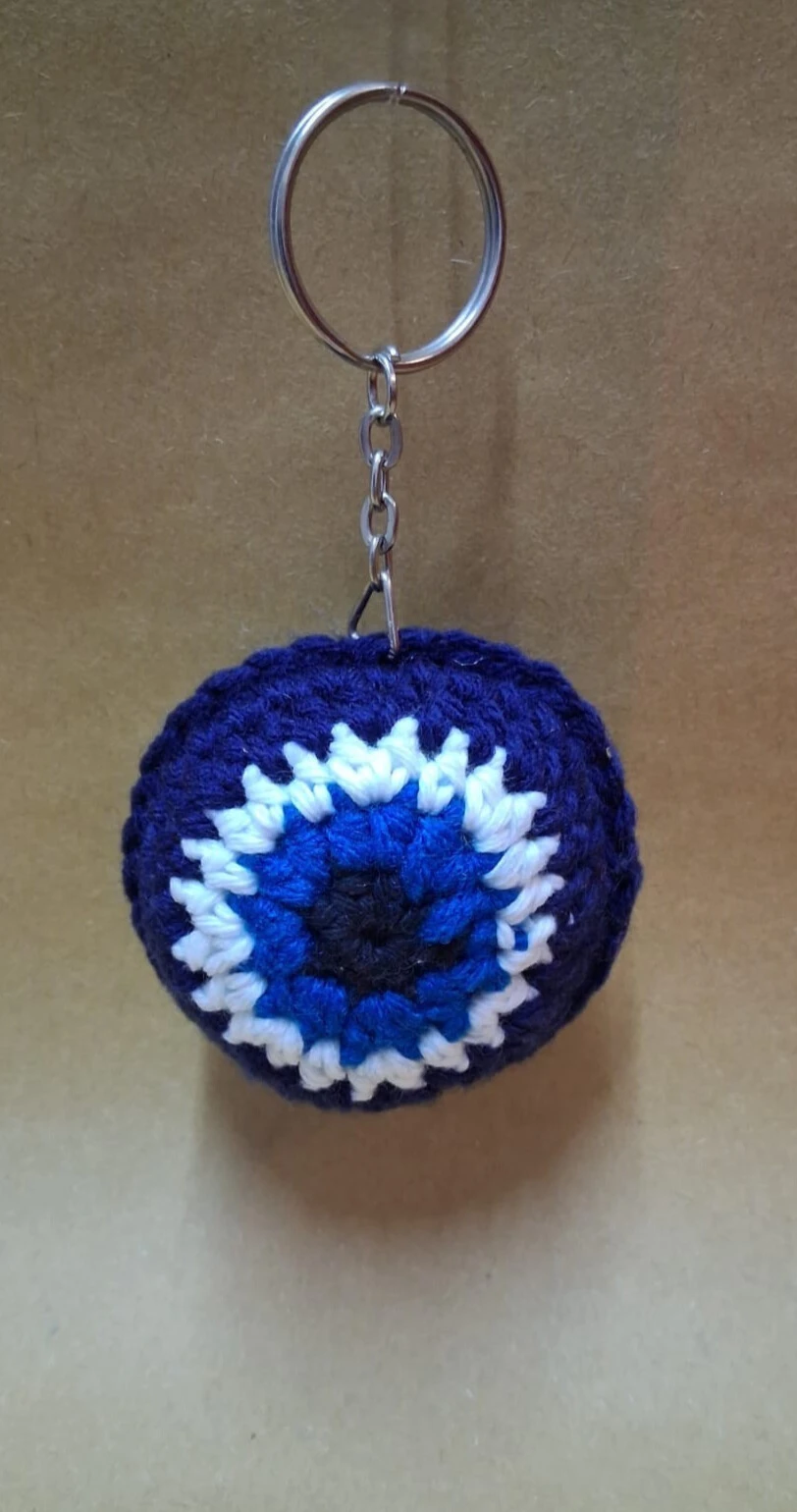 Tejí estos amuletos a mano con la intención de que cuiden tus llaves (y tu camino) a donde vayas. Están confeccionados en hilo de algodón resistente, con los colores clásicos del talismán: azul profundo, celeste y blanco.