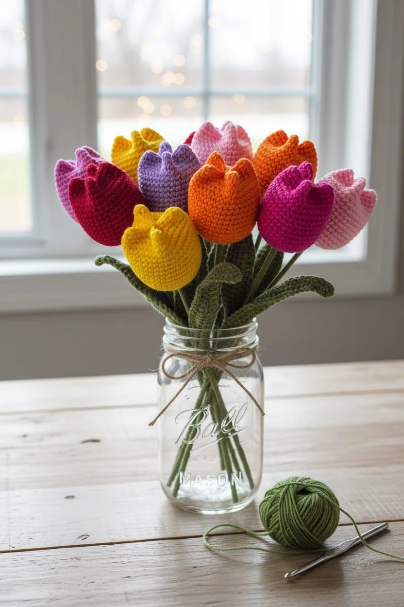 Nuestros tulipanes tejidos a crochet son una expresión delicada de belleza artesanal. Cada flor está cuidadosamente elaborada a mano, con detalles que evocan la frescura y la elegancia de los tulipanes naturales, pero con la calidez única del tejido.